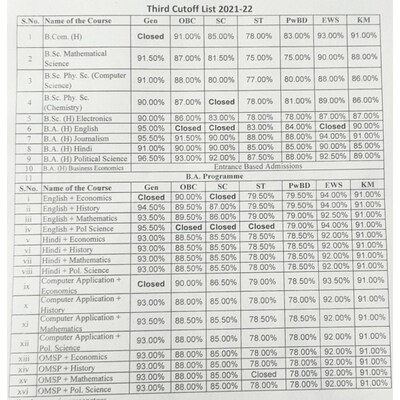 For most courses the cut-off still remains over 90. After seeing a marginal decrease in the second cut off by 05 to 1 and a perfect score in the first list the third cut off too is expected to remain above 90 especially for top colleges such as Miranda House Hindu College Ramjas College etc however several colleges have also closed their admissions. Delhi University Third Cut off 16 Oct 2021 Arts Science Commerce.